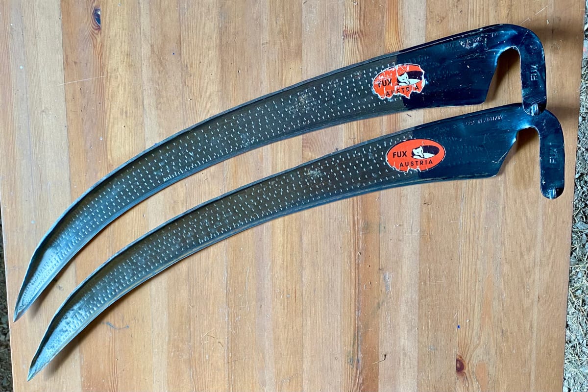These blades were used on a scythe course in 2025. They have been edge peened by Phil but show some signs of light use (worn label, some wear to lacquer) and have some minor rust marking under the lacquer. The marking will have no long term impact on their function.