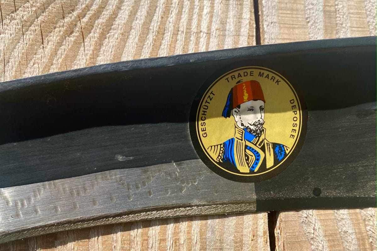 “NOTE TO MOWERS. Like all superior articles our “Turk’s Head” scythe is the object of many counterfeits by unscrupulous competitors. Therefore the consumer is strongly advised in their own interest to be careful before purchasing and to make sure the scythe bears the registered Turk’s Head brand stamped in gold on the handle with the inscription “Turk’s Head Sickle – unsurpassed cut”. Those that do not meet these requirements are counterfeit blades and should not be purchased because in terms of workmanship, quality of steel, cut and durability, real Turk’s Head Scythes are unsurpassed.”